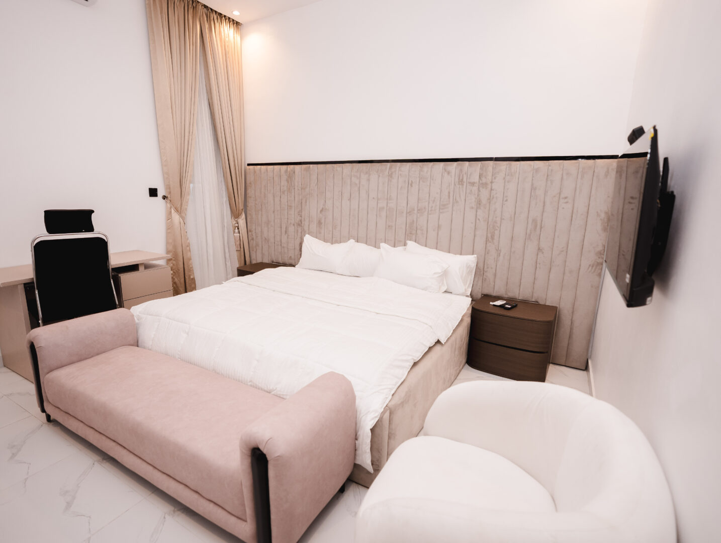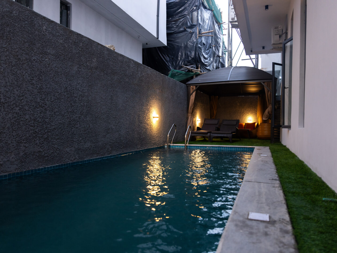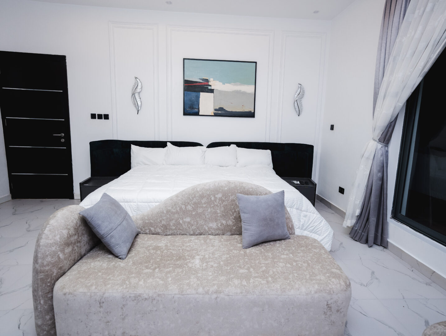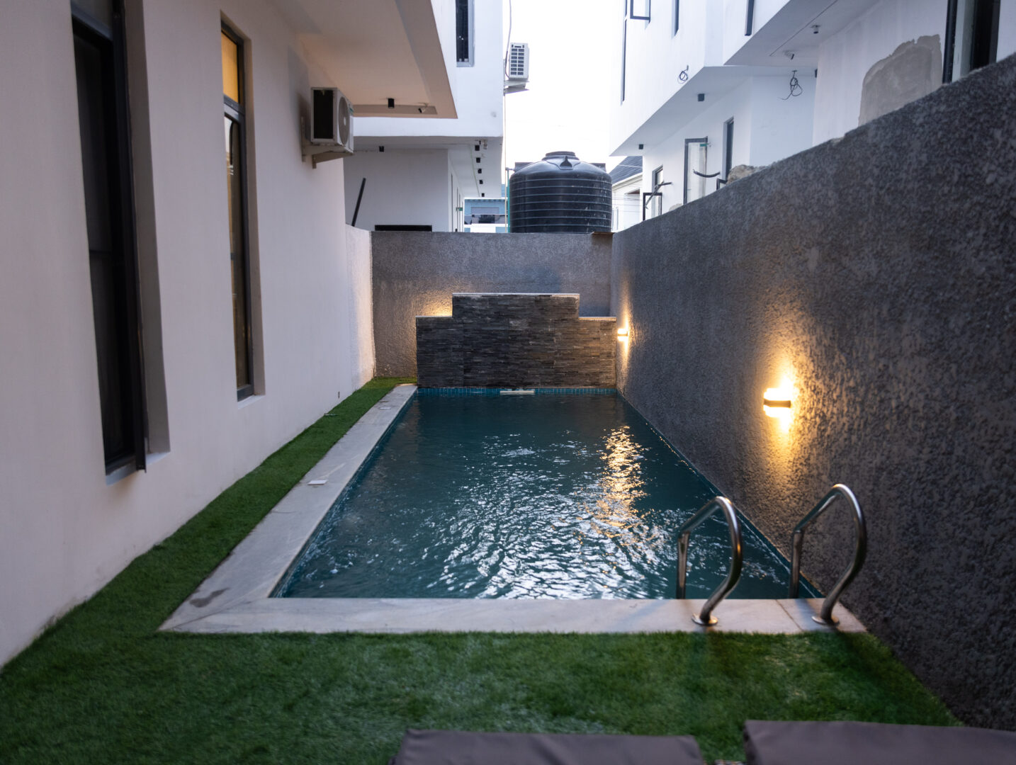 Our flagship 4 bedroom apartment for family and corporate rest in Lekki Lagos. It features a large private pool and outdoor sitting area. Estate facilities include a tennis court, soccer pitch and children’s playground.